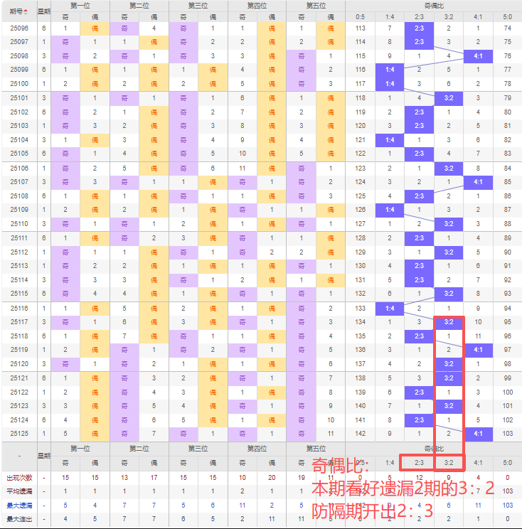上期奇偶比:4:1,近10期奇偶比出现情况:1:4、3:2、2:3、4:1、3:2、3:2、2:3、3:2、2:3、4:1,最近10期出现4期3:2,出现3期2:3,出现2期4:1,出现1期1:4,出现0期5:0,出现0期0:5,根据近10期规律本期看好遗漏2期出3:2,防隔期开出2:3,综上所述推荐奇偶比推荐:2:3,重点关注:3:2。