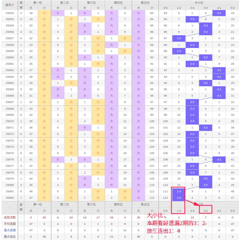 上期大小比:1:4,近10期大小比出现情况:2:3、2:3、2:3、4:1、2:3、2:3、3:2、3:2、1:4、1:4,最近10期出现2期3:2,出现5期2:3,出现1期4:1,出现2期1:4,出现0期5:0,出现0期0:5,根据近10期规律本期看好遗漏2期的3:2,防三连出1:4,综上所述推荐大小比推荐:1:4,重点关注:3:2。