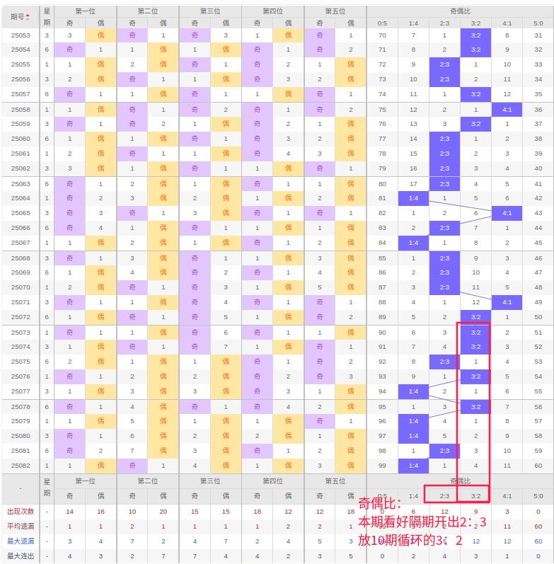 上期奇偶比:1:4,近10期奇偶比出现情况:3:2、3:2、2:3、3:2、1:4、3:2、1:4、1:4、2:3、1:4,最近10期出现4期3:2,出现2期2:3,出现0期4:1,出现4期1:4,出现0期5:0,出现0期0:5,根据近10期规律本期看好隔期开出2:3,防10期循环的3:2,综上所述推荐奇偶比推荐:3:2,重点关注:2:3。