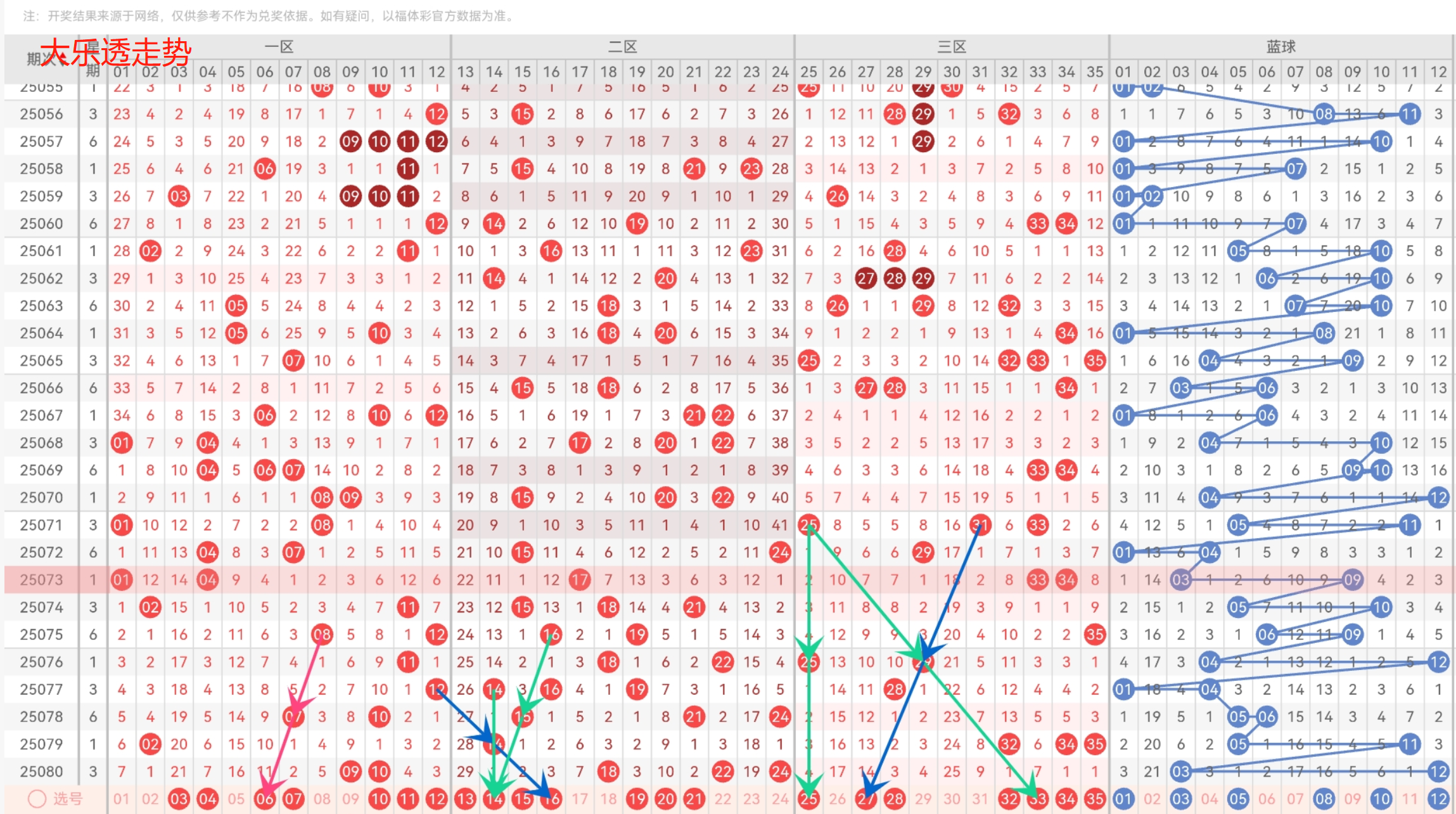 推荐大底:一区:4-6-7-9-12,二区:13-15-16-20-21;三区:25-28-32-33-34;蓝区1-3-5-8-10