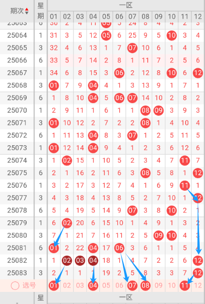 首先把当前区段号码分为三类,(遗漏期数0~6为热号)(遗漏期数7~12温)(遗漏期数13以上为冷号