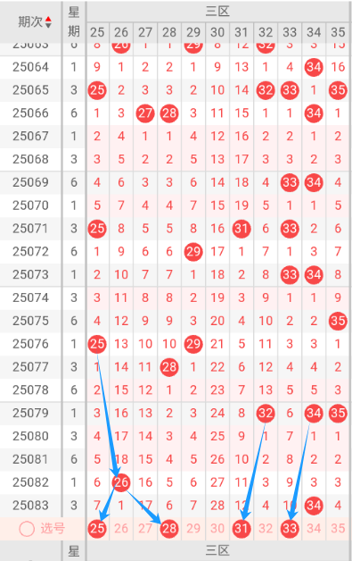 我个人对大乐透号码分析主要有四点。一、采用遗漏数据,把所有号码分三类(热号)(温号)(冷号),二、区间比出号情况,三、查阅前三年对应期数开奖号码对比分析,四、再结合和值大小走势进行分析选号。