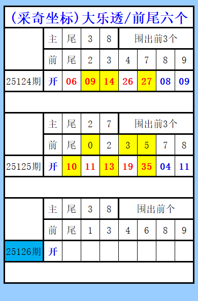 本期看好相生或相克尾号,开出的范围是3码至4码之间。近9期开出五行尾号分别是,117期前区尾号五行缺火2+7、118期前区尾号五行缺土0+5、119期前区尾号五行全、120期前区尾号五行缺金4+9、121期前区尾号五行缺土金0+5+4+9、122期前区尾号五行缺土金0+5+4+9、123期前区尾号五行缺火2+7、124期前区尾号五行缺土木0+5+3+8、125期前区尾号五行缺火2+7。看好3期之内重五行尾号开出2号以上规律,概率在九成左右。相生或相克尾号有开出4码的可能性,大家可以筛选一下,本期看好的五行六个尾号是(1+6)(3+8)(4+9)