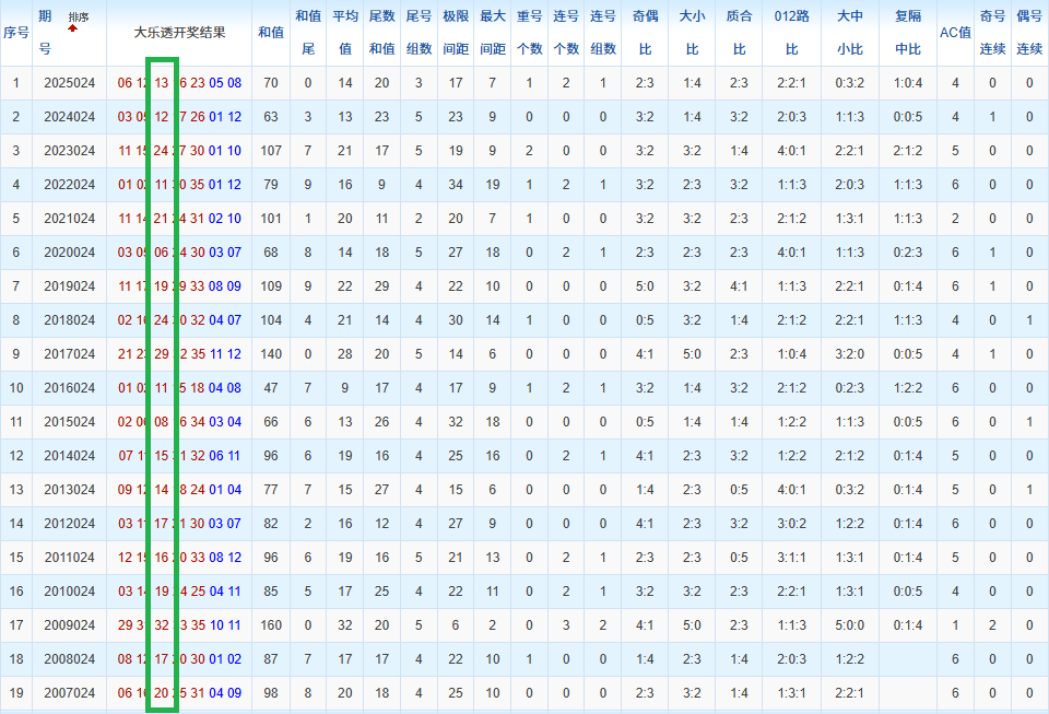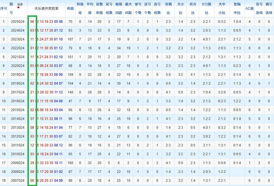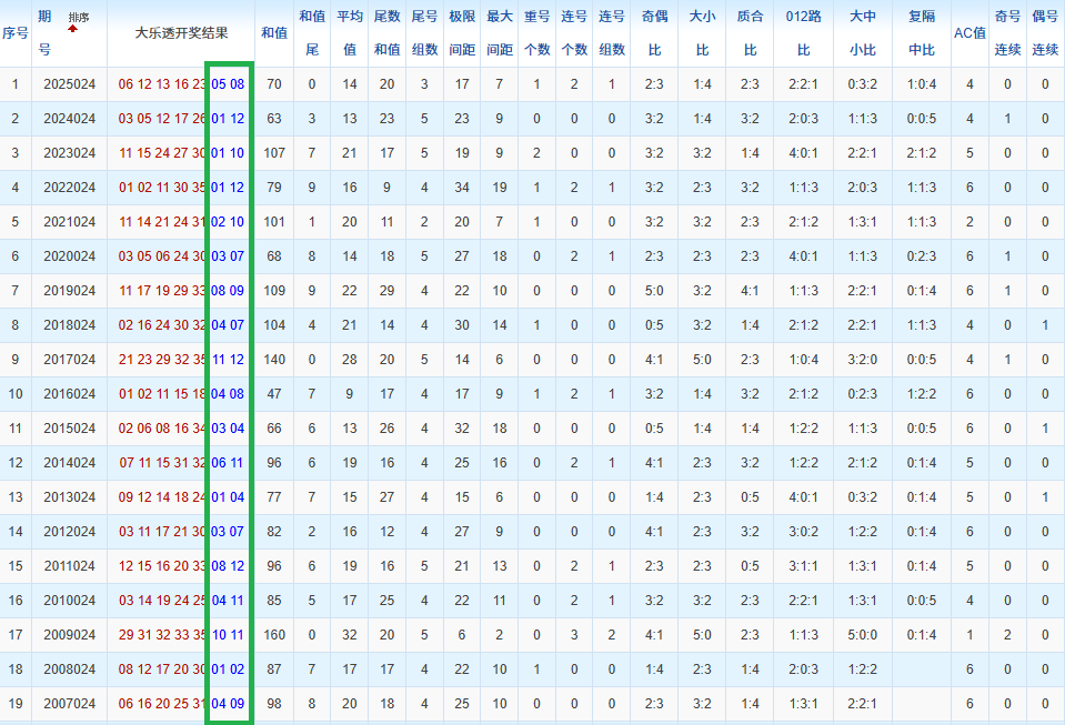 通过观察,我发现往年同期的开奖数据与本期号码之间存在显著关联。具体来说,在前区号码中,从第一位至第五位,通常会有约三个位置上的数字与往年同期相同位置的号码一致;而后区号码中,也有多期开奖结果直接包含了往年同期的数字。因此,我们可以借助往年同期各位置上的号码,作为分析本期开奖情况的重要依据。在此基础上,还可结合往年同期的其他相关条件,进行综合性的号码组合推荐。