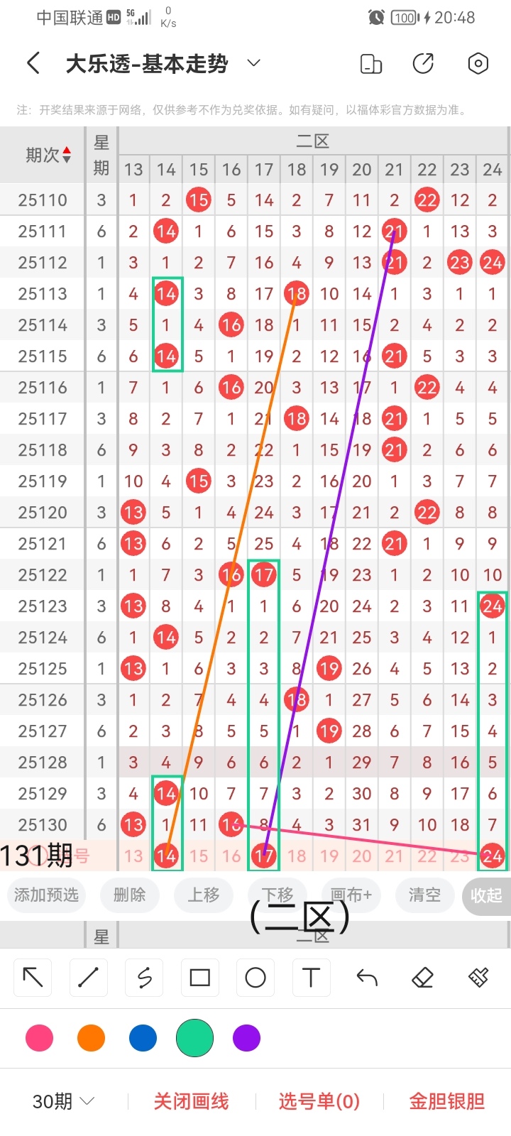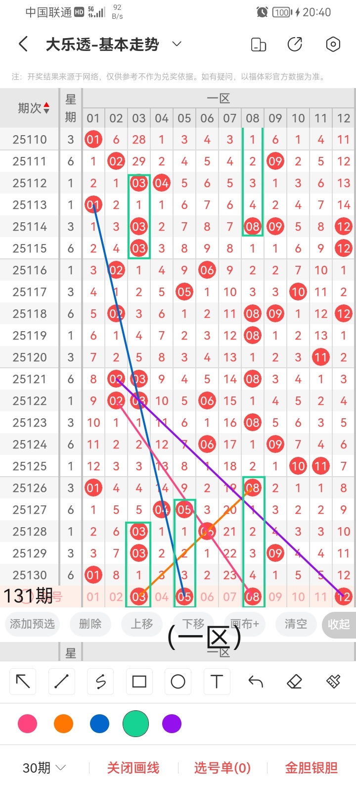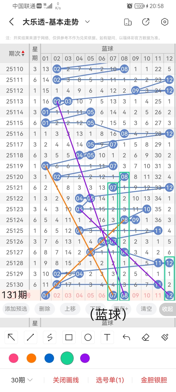 小梁根据图中画线思路,最后给大家汇总提供一下大乐透本期红球、蓝球数据,供大家参考: