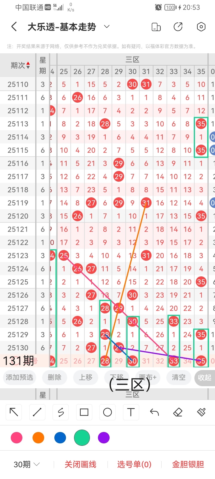 通过以上对上期的简单回顾,下面进入大乐透第2025131期(下面简称本期)的选号分析: