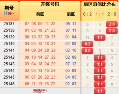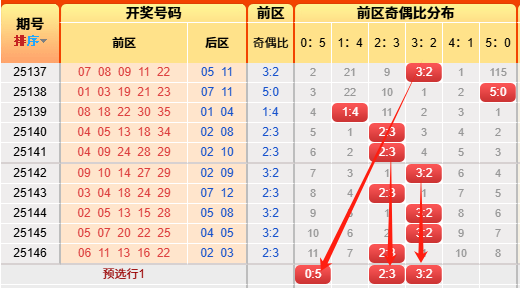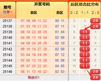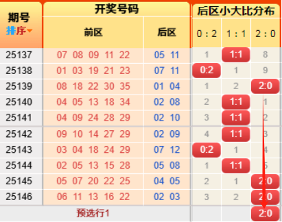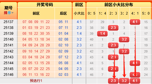 上期前区小大比4:1,命中啦,近期统计63期中56期。言归正传我们继续用历史数据说话,前区小大比分成6种0:5、1:4、2:3、3:2、4:1、5:0(如图),我统计了一下历史出现次数,0:5出现106次、1:4出现514次、2:3出现976次、3:2出现810次、4:1出现355次,5:0出现53次,再看近10期小大比出现次数比为0:1:4:2:3:0,通过历史数据对比观察以及根据遗漏对称理论原则,故本期我们选择2:3、3:2、4:1;(具体精准方向请查看小车小大比精选)
