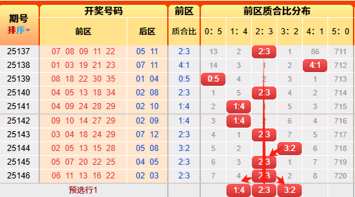 上期质合2:3,近54期命中51期范围。来看历史次数统计0:5出现270次、1:4出现908次、2:3出现1013次、3:2出现514次、4:1出现101次、5:0出现7次,再看近十期质合比出现的次数比1:2:5:1:1:0,冷值5:0暂时放弃,再结合图形来看,本期趋势看顺路,初步选择为2:3、1:4、3:2。(具体请点击本条上车查看精选质合比 )