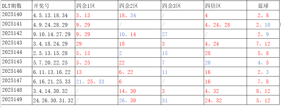如图,红色字体是重复开出的号码,即为热号。蓝色字体是开出一次的号码,即为冷号。以近10期为一个分析周期:4余1区、4余3区,走势较冷;4余2区、4倍数区,走势较热。依据久热必冷,久冷必热的规律,本期重点关注:4余1区、4余3区,区间号码可能开出2-3个;4余2区、4倍数区,区间号码可能开出1-2个。区间冷热号码精选:***(会员专区可见)。个人分析,仅供参考。
