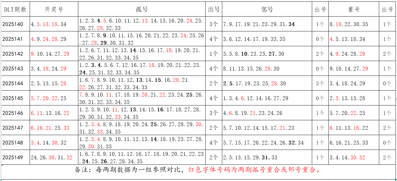 如图,以近两期数据为一组,进行对比分析,相同的孤号、邻号可能在下期开出。本期参考孤号:1.2.3.4.5.6.7.8.9.10.11.12.13.14.15.16.17.18.19.20.21.22.28.34.35;邻号:23.25.27.29.33。重点关注:孤邻号重合号码:***(会员专区可见)。个人分析,仅供参考。