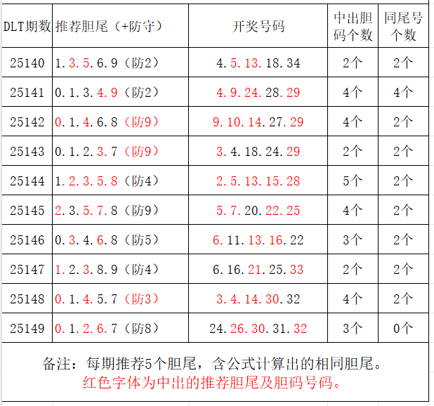 如图,每期推荐胆尾中出1-4个。上期推荐胆尾中出3尾3码!推荐胆尾是按照公式计算的顺序,不定位红球号码的顺序。本期推荐胆尾:8尾/4尾/5尾/1尾/0尾,加推防守胆尾+胆码号码:***(会员专区可见)。个人分析,仅供参考。