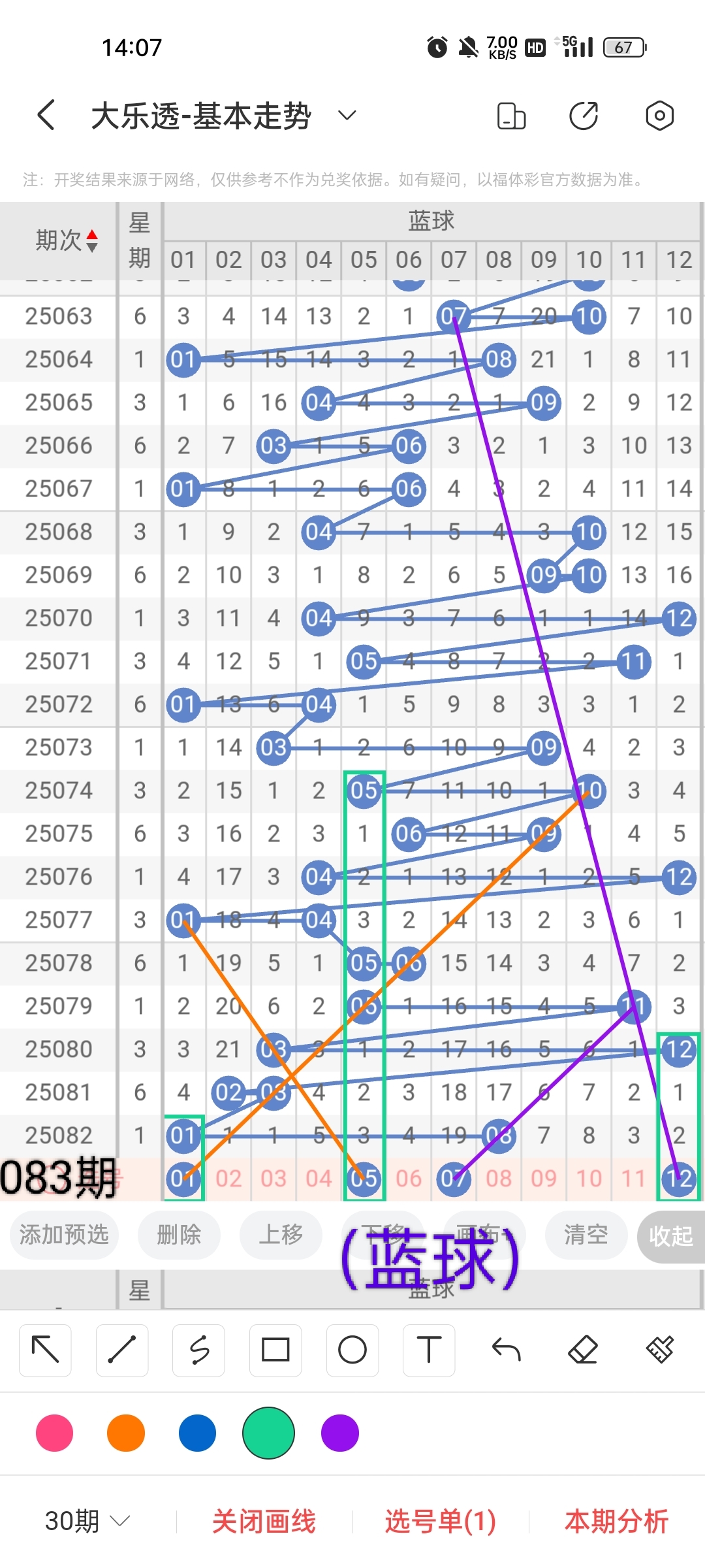小梁根据图中画线思路,最后给大家汇总提供一下大乐透本期红球、蓝球数据,供大家参考: