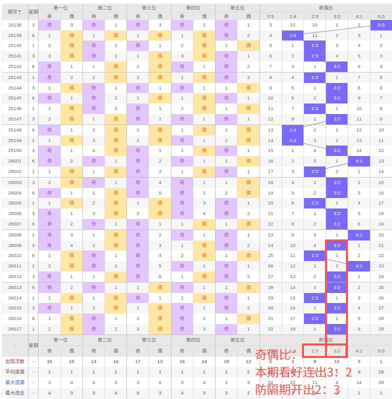 上期奇偶比:3:2,近10期奇偶比出现情况:4:1、3:2、2:3、4:1、3:2、3:2、2:3、3:2、2:3、3:2,最近10期出现5期3:2,出现3期2:3,出现2期4:1,出现0期1:4,出现0期5:0,出现0期0:5,根据近10期规律本期看好连出的3:2,防隔期出2:3,综上所述推荐奇偶比推荐:2:3,重点关注:3:2。