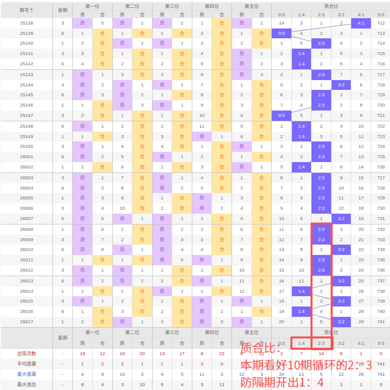 上期质合比:3:2,近10期质合比出现情况:2:3、2:3、3:2、2:3、2:3、3:2、1:4、3:2、1:4、3:2,最近10期出现4期3:2,出现4期2:3,出现0期4:1,出现2期1:4,出现0期5:0,出现0期0:5,根据近10期规律本期看好10期循环的2:3,防隔期开出1:4,综上所述推荐质合比推荐:1:4,重点关注:2:3。