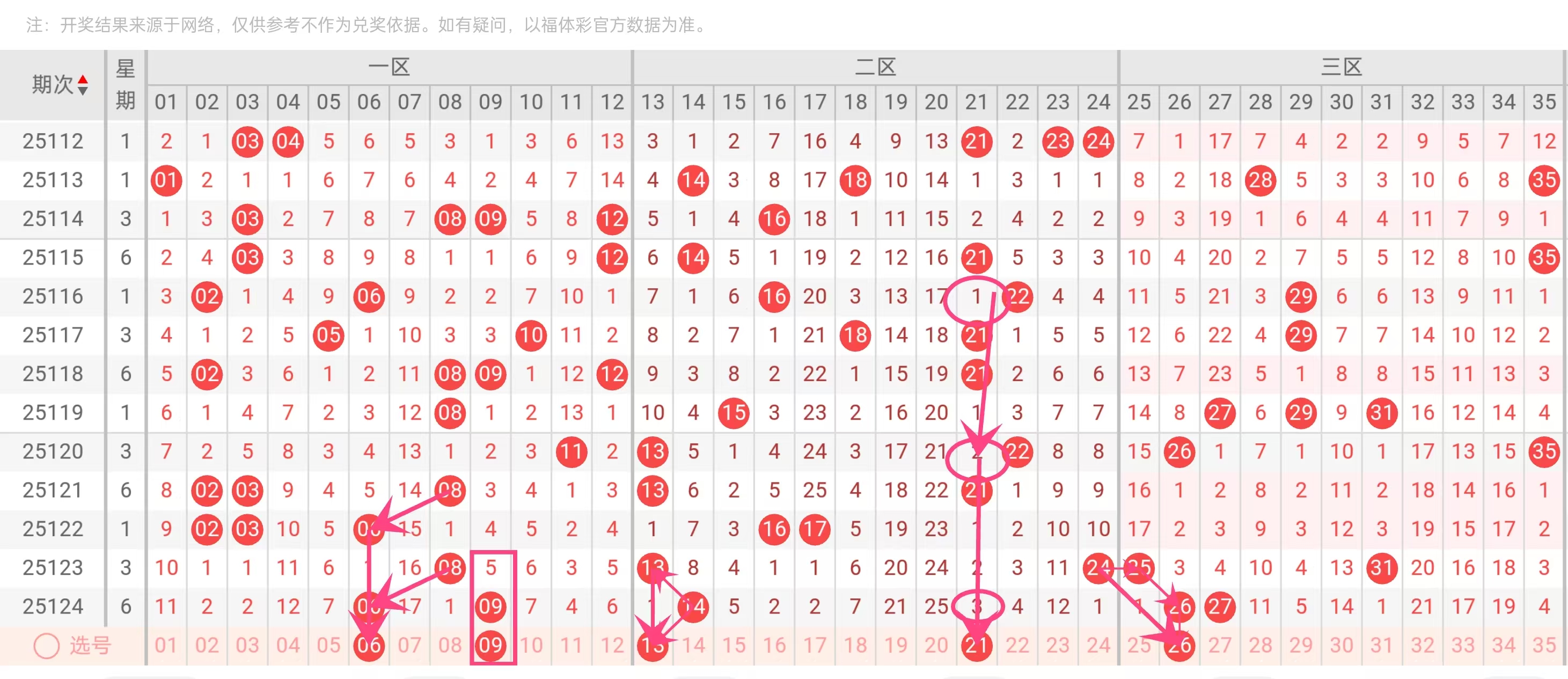 整体覆盖:推荐号码覆盖了前区的多个热点区域,06和09代表小号热区,13和21代表中段活跃区,26代表大号热区,形成了全面布局。