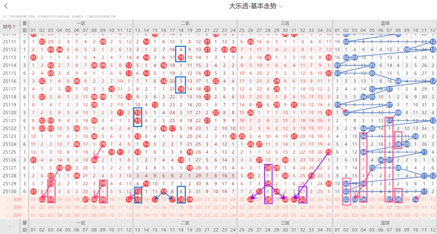 上一期后区开出02-11,后区奇偶比为0:2,大小比为0:2,质合比为1:1;本期后区需要关注的号码:02可能会三重出;03遗漏值高且与04-05形成了斜连走势;04为隔期码;07-08为后区出号热点号码;10为邻号;因此本期后区看好02-03-04-07-08-10等号码。