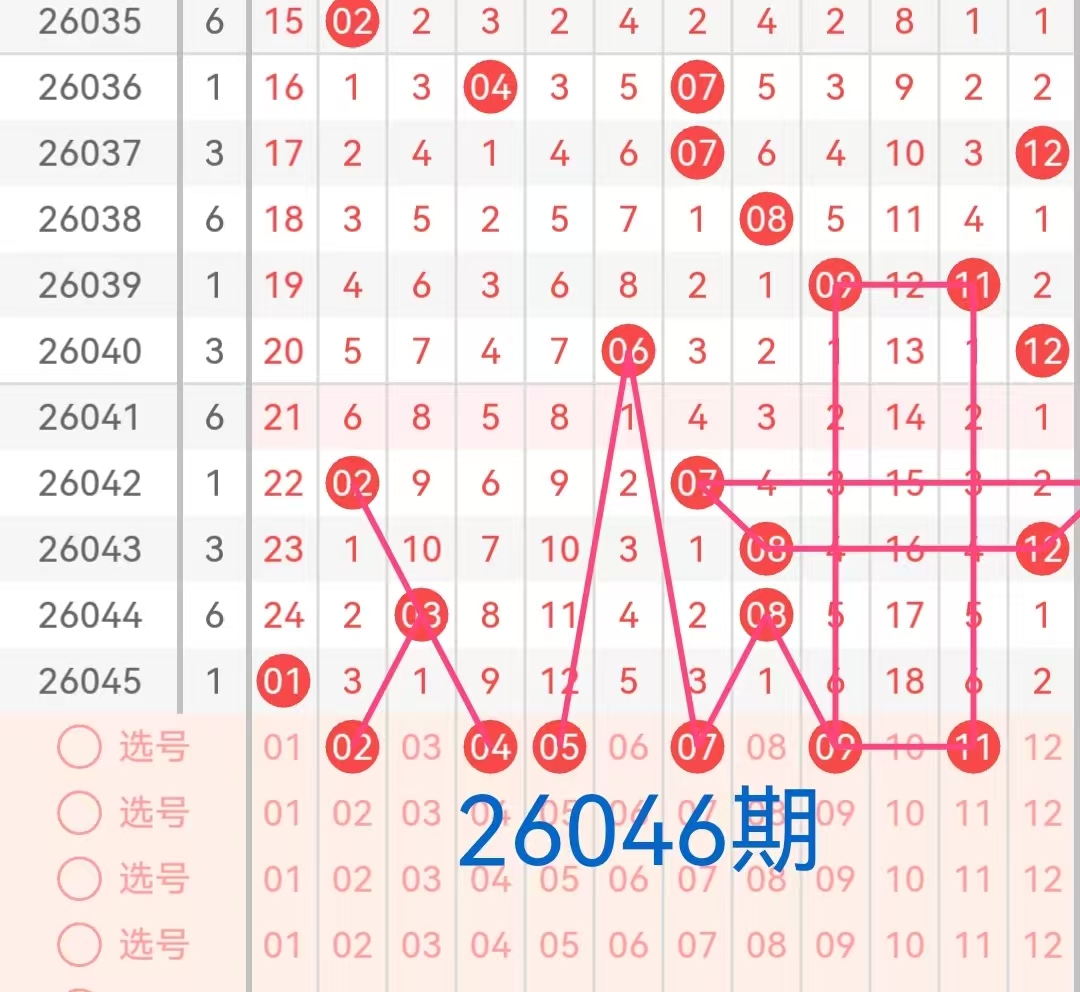 后区号码范围为01-12,分为两个区间:小号(01-06)和大号(07-12)。上期开奖号码为04和07,为一小一大号的组合。