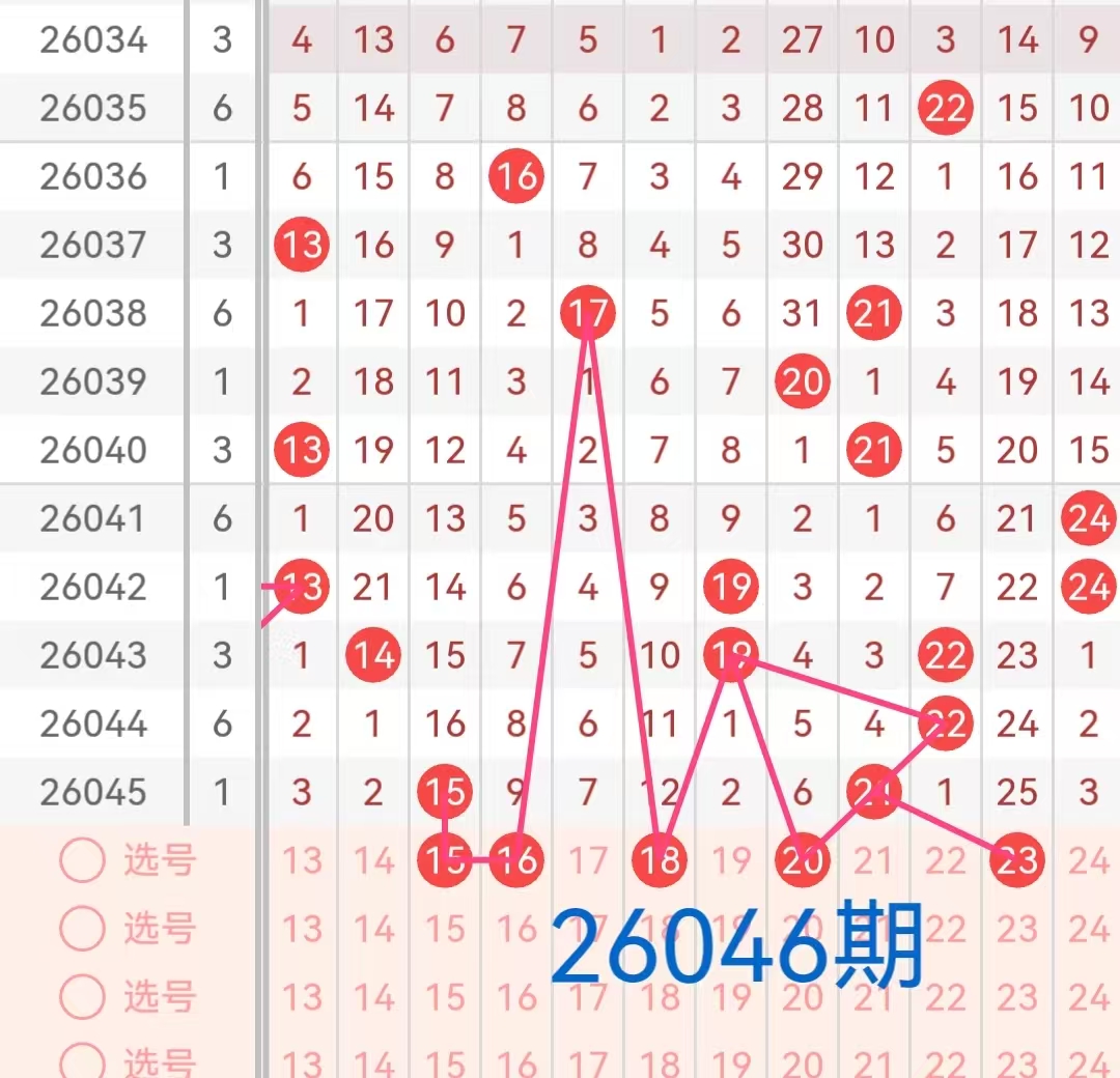 2. 二区(13-24):上期该区间开出两个号码15和21,号码15在遗漏16期后开出,号码21在遗漏4期后开出,且与上期开出的号码22形成斜连走势。根据历史开奖来看,近期该区间活跃度较高,本期预计会有1-2个号码会继续开出。特别是那些遗漏次数较大的号码18、23和该区间内近期表现较好的号码15、16、20这个号码在走势上表现出一定的稳定性,且与前几期出号形成呼应,有望出现在本期开奖中。