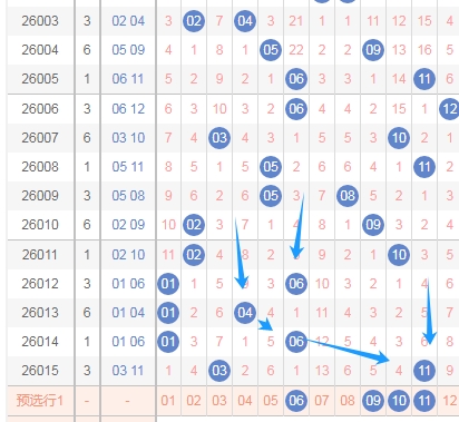 我在上面体彩大乐透后区标注出来的数字,是我觉得后区第二个数字的范围,关注数字06 09 10 11,因为你们看上面标注出来的蓝色大箭头,最近开出的遗漏周期大的数字居多,那么本期就关注后区第二个数字出遗漏周期的小数字06 09 10 11。