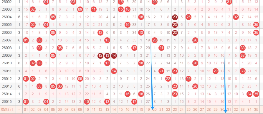 上图是体彩大乐透前区号码走势分布图,你们看看蓝色箭头标注出来的就是2字头数字的区域,这个区域上期一个都没出现,最近几期这个区域出号码也不是很多,尤其数字24 25 26 27 28 29这边最近4期出号码不多,所以本期关注2字头数字出2个或者3个。