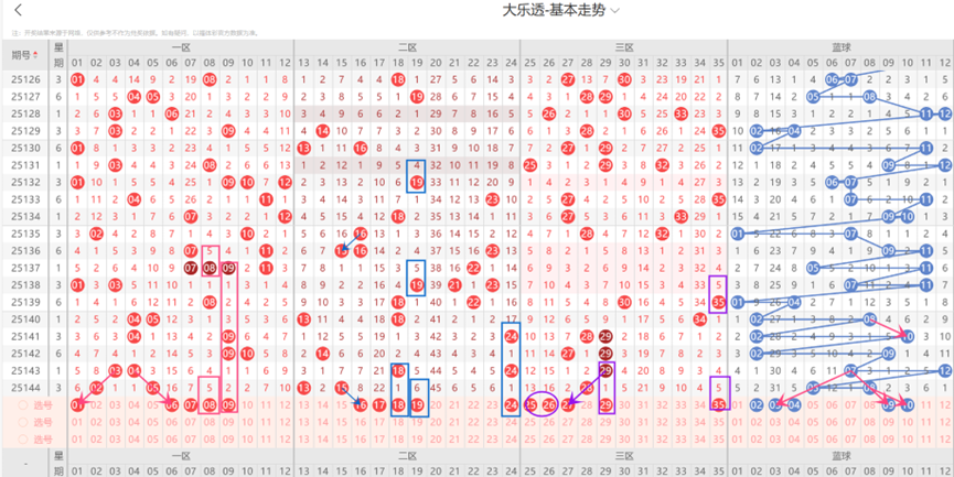 上期三区开出了1个号码,本期三区大概率不会断区,本期三区出号数量可以考虑1-2个;本期三区需要关注的号码:25-26遗漏值高,本期可能会一起落号;27与28-29形成了斜连走势;29为隔期码;此外遗漏值较低的35,值得防守;因此本期三区选号范围为25-26-27-29-35等号码。