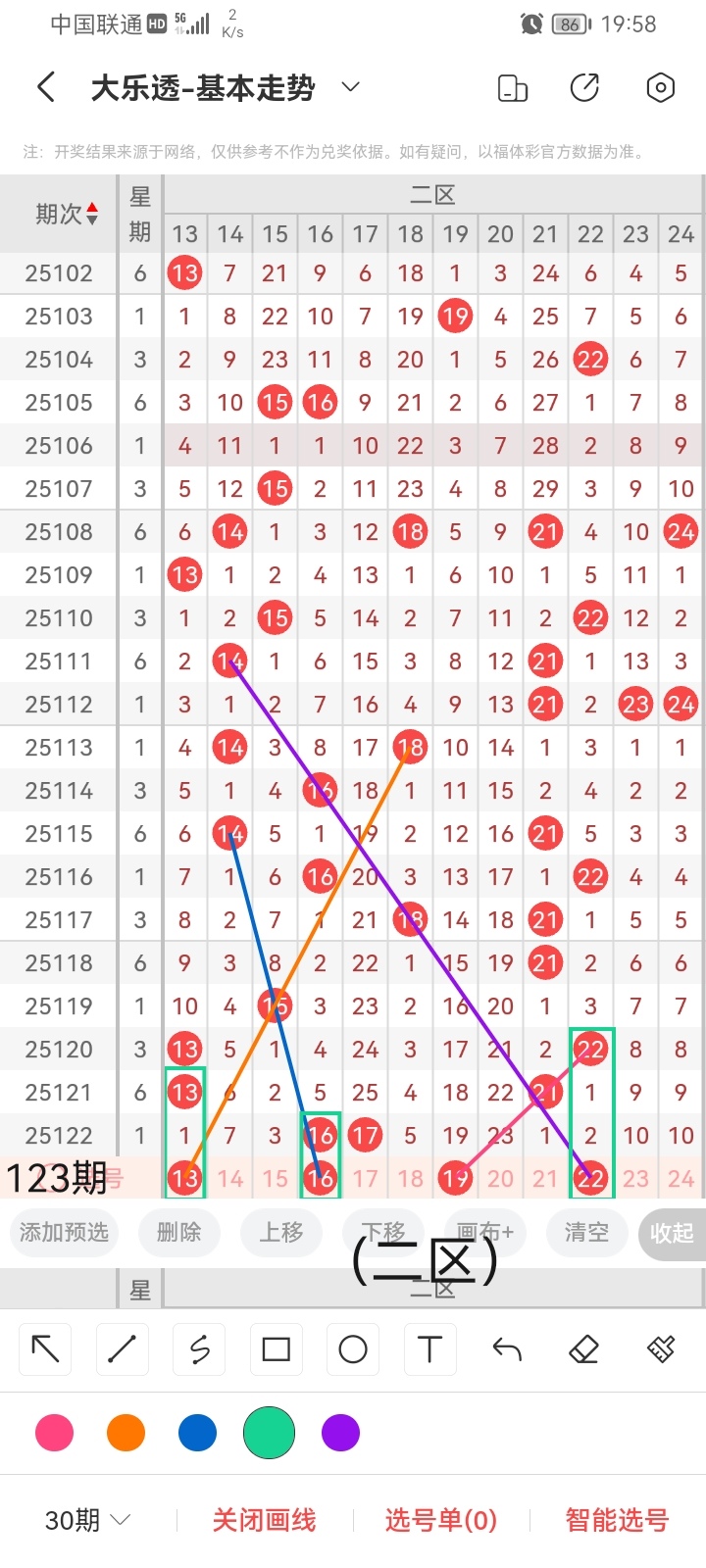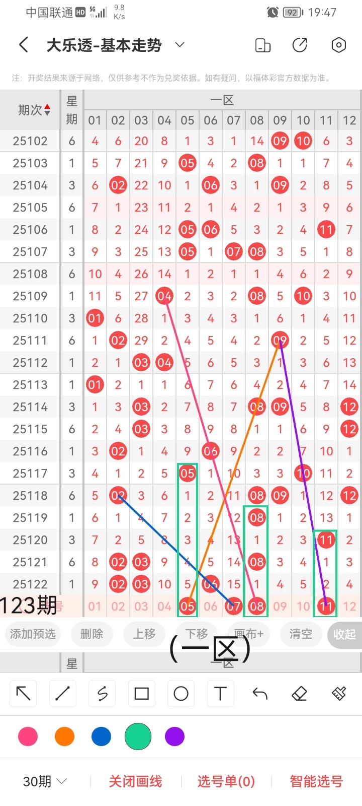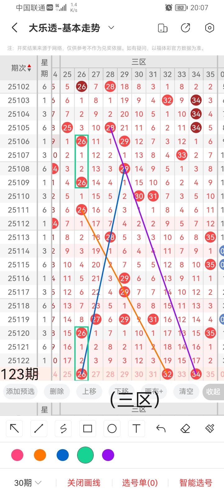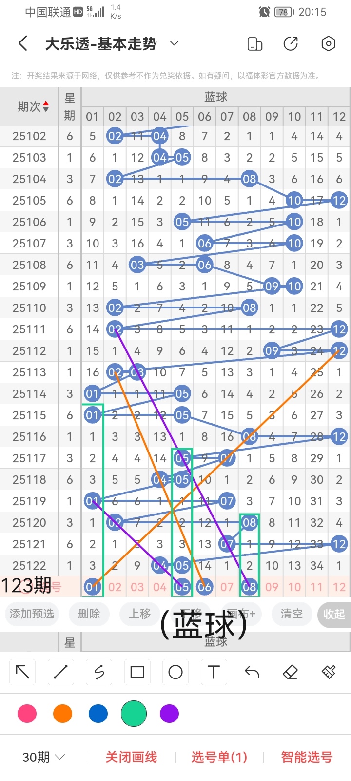 小梁根据图中画线思路,最后给大家汇总提供一下大乐透本期红球、蓝球数据,供大家参考: