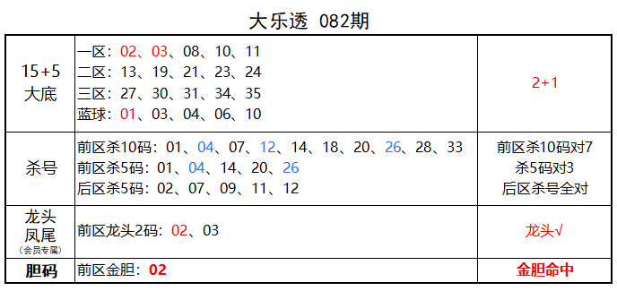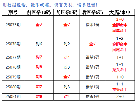 上期前区杀10码对7,杀5码对3,金胆命中,龙头命中,后区杀5码全对。