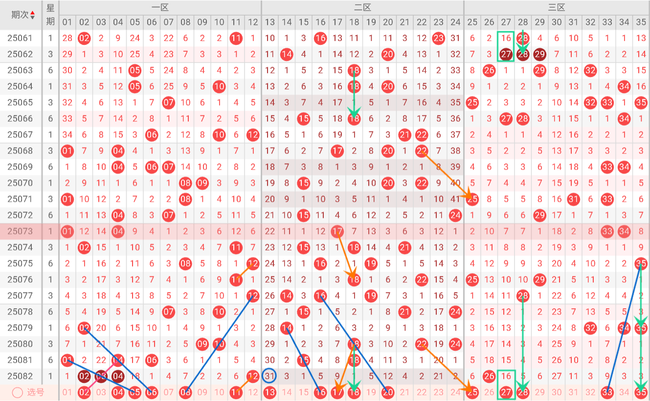 三区(25-35)分析:上期该区开出号码26,近10期占比20%,与上期相比无变化。本期无三斜连号趋势,隔码斜连走势:27 35。近5期断区三次,连续2次断区后,上期仅开出1码。虽然整体弱势,但具体看32-35区间其实保持着50%的出现率,真正的冷区是26-31。上期26的出现可能是冷区解冻信号,本期可能出号1-2枚,推荐关注号码:25、27、28、33、35。