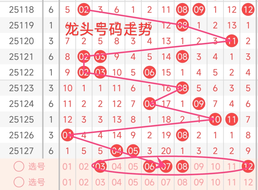 上期龙头号码为04,振幅上升了3点,开出偶数号码。从近期龙头号码的走势来看,近期龙头号码波动频繁。上期龙头为04,偶数号码。从近期龙头走势来看,近期龙头号码多在红一区号码之间开出,预计本期龙头号码会继续在这个区间开出。从近期龙头号码的奇偶开出来看,近期龙头奇偶开出较为均衡上期龙头号码开出偶数号码,预计本期龙头号码可以注意奇数号码开出。本期还需注意连续多期漏出的号码,需重点关注,有回补龙头号码的趋势。 综合考虑,本期龙头号码推荐关注:03、06、07、08、12。