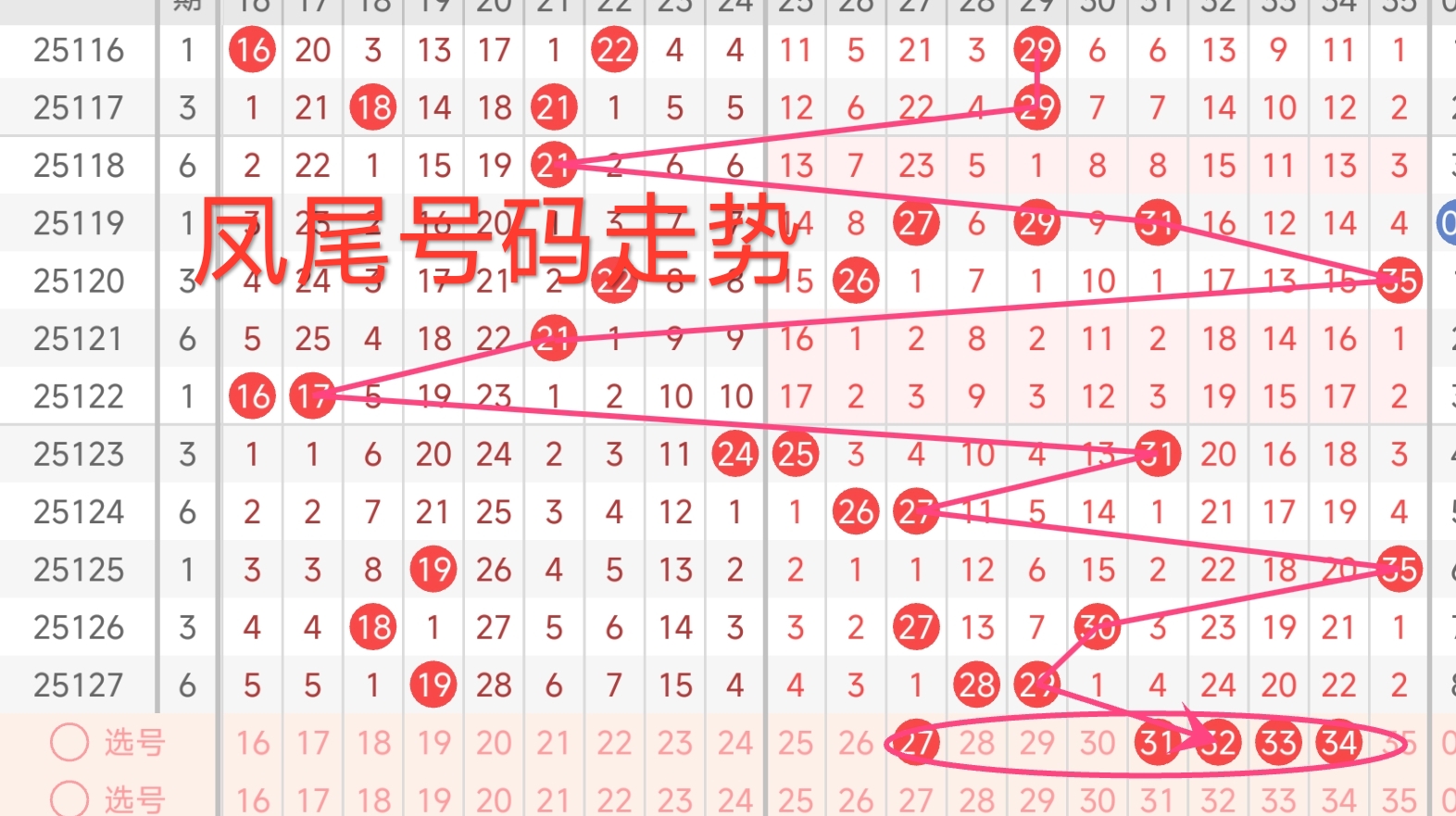 上期凤尾号码为29,振幅下降了1点,开出奇数号码。从近期凤尾号码的走势来看,近期凤尾号码波动较大。上期凤尾为29、奇数号码,近期凤尾号码波动幅度较大,根据近期凤尾号码走势来看,近期凤尾号码在红二区与红三区之间波动开出。预计本期凤尾号码会红三区号码开出,本期凤尾号码可以重点关注26 - 35区间。本期还需注意连续多期漏出的号码,需重点关注,有回补凤尾号码的趋势 。综合考虑,本期凤尾号码可以重点关注27、31、32、33、34。