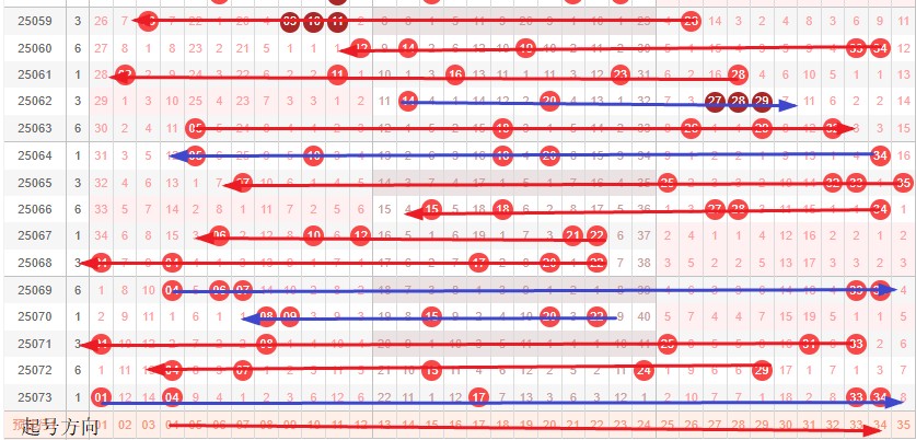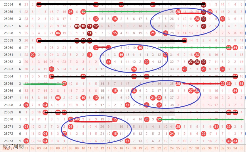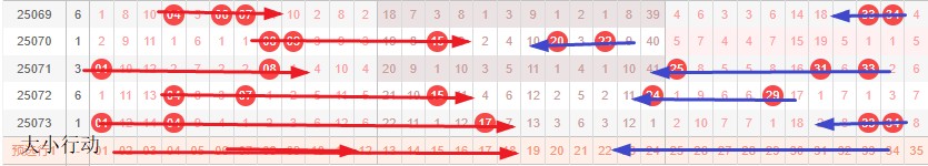如图所示:体现的是3个局部走势的发展周期,圆圈为密集处的填空,本期定性为新局部走势第1期,画线期,造成号码密集,主动调整空间。上期大空间就4-17和17-33属于填走势空间,即就是调整2两空间,是均分几个小空间,则无连号,继续保留2个大空间则看连号组。即本期大小34布局,大小均可出34布局。关键界定本期首尾是压缩则小首码,右推则中高开。