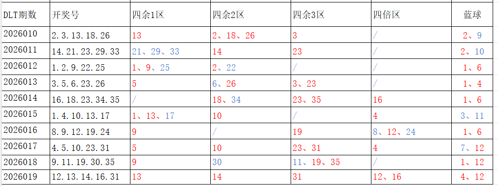 分享第一个数据分析:四分区统计数据。相对于传统的三分区,个人习惯使用四分区,就是把35个红球号码除以4,所得的余数分区如下: