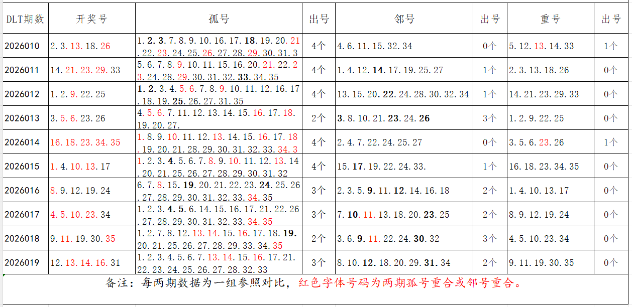 如图,以近两期数据为一组,进行对比分析,相同的孤号、邻号可能在下期开出。本期参考孤号:1.2.3.4.5.6.7.8.9.10.18.19.20.21.22.23.24.25.26.27.28.29.33.34.35;邻号:11.15.17.30.32。重点关注:孤邻号重合号码:***(会员专区可见)。个人分析,仅供参考。