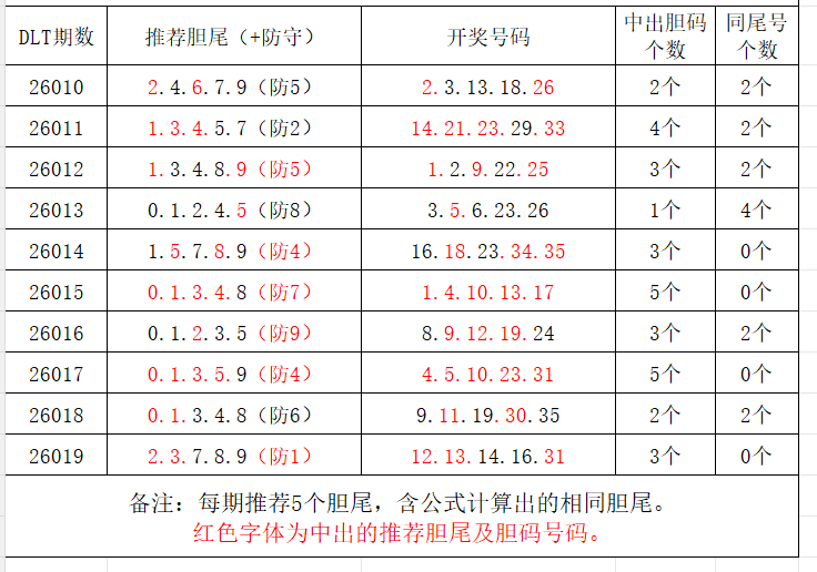 分享第三个数据分析:依据推荐的胆尾,推定胆码号码。每期计算出5个胆尾,做为推荐胆尾。以近10期推荐胆尾的统计数据为例: