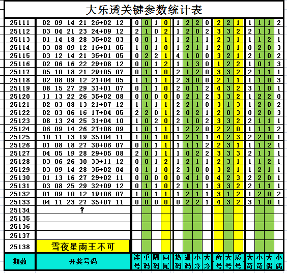 以下是作者手工统计的大乐透关键参数统计表,对喜欢参数分析、过滤缩水、选号胆杀的技术性大乐透爱好者有所帮助,其它读者可略过不看。