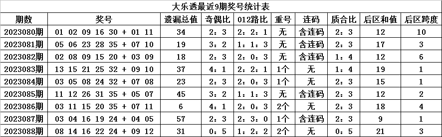 后区跨度:后区近9期跨度分别开出10-3-6-1-1-2-4-1-3,跨度奇偶比为5:4,上期跨度上升2个点位,本期看好跨度继续上升,预计开的偶数跨度,关注跨度4。