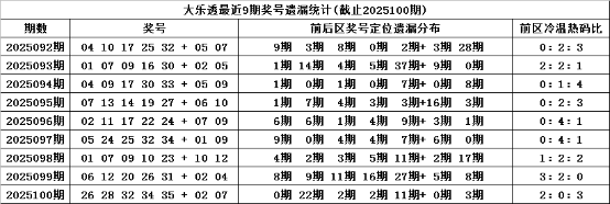 体彩大乐透第2025100期奖号为:26 28 32 34 35 + 02 07,各位号码遗漏期数分别为:0期、22期、2期、2期、11期+0期、3期,前区号码遗漏总期数为37期,012路比为0:2:3,奇偶比为1:4,包含1个重复号码:26。后区号码遗漏总期数为3期,和值为9,跨度为5。