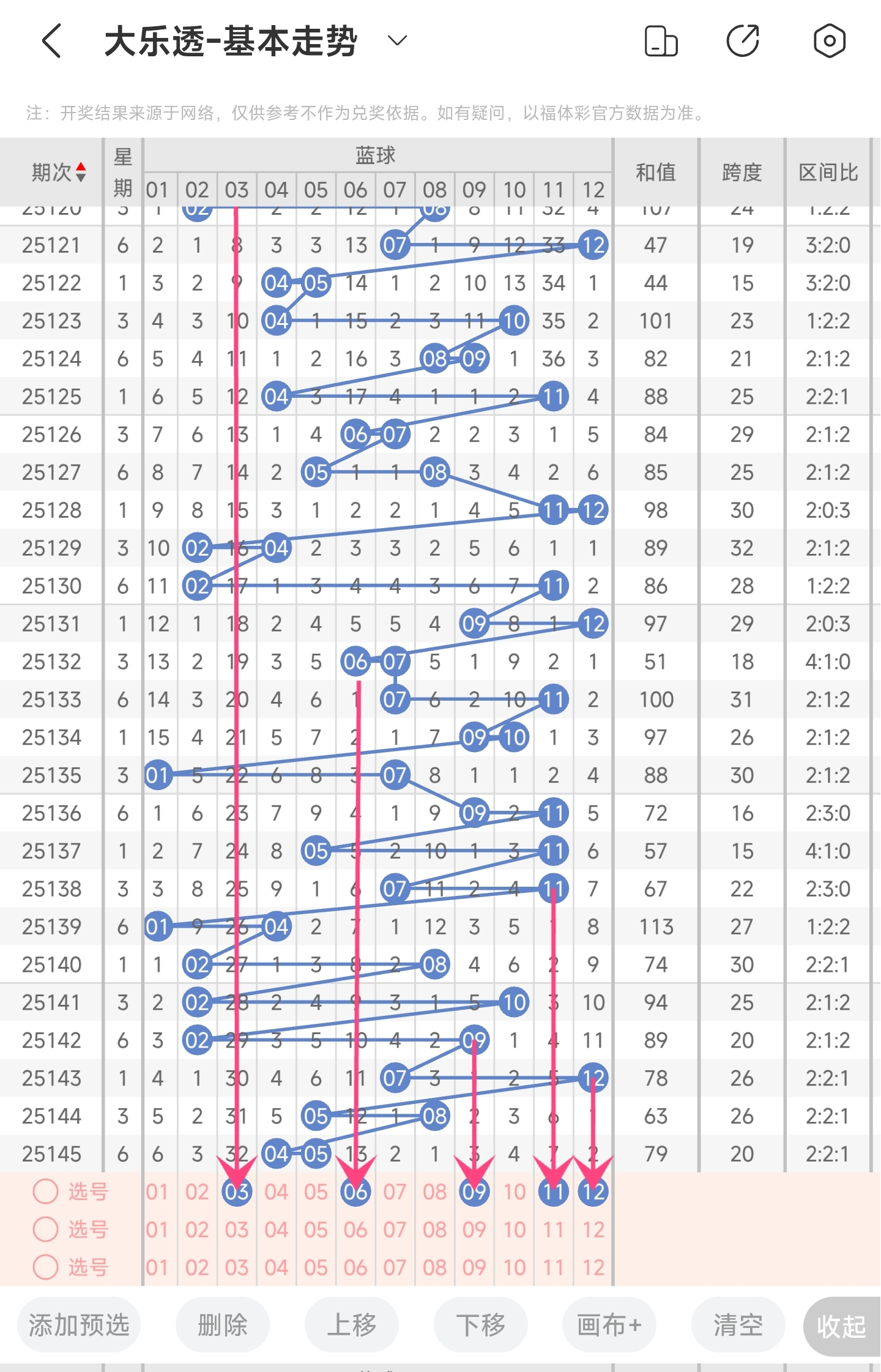 上期开出了4,5号球。往前一期开出了5,8号球。通过分析蓝区走势图,我们可以看到蓝区开出的号码跨度整体大多数情况下基本遵循一大一小这样子开。上期开了最小跨度的号码,本期大概率会变大。从开号位置来看,本期比较看好左边和右边的号码开出,其次是中间的。最后再结合冷热号情况以及遗漏期数,本期我们可以关注3,6,9,11,12等号。综上所述本期我们推测可能开出3,6,9,11,12等号码。