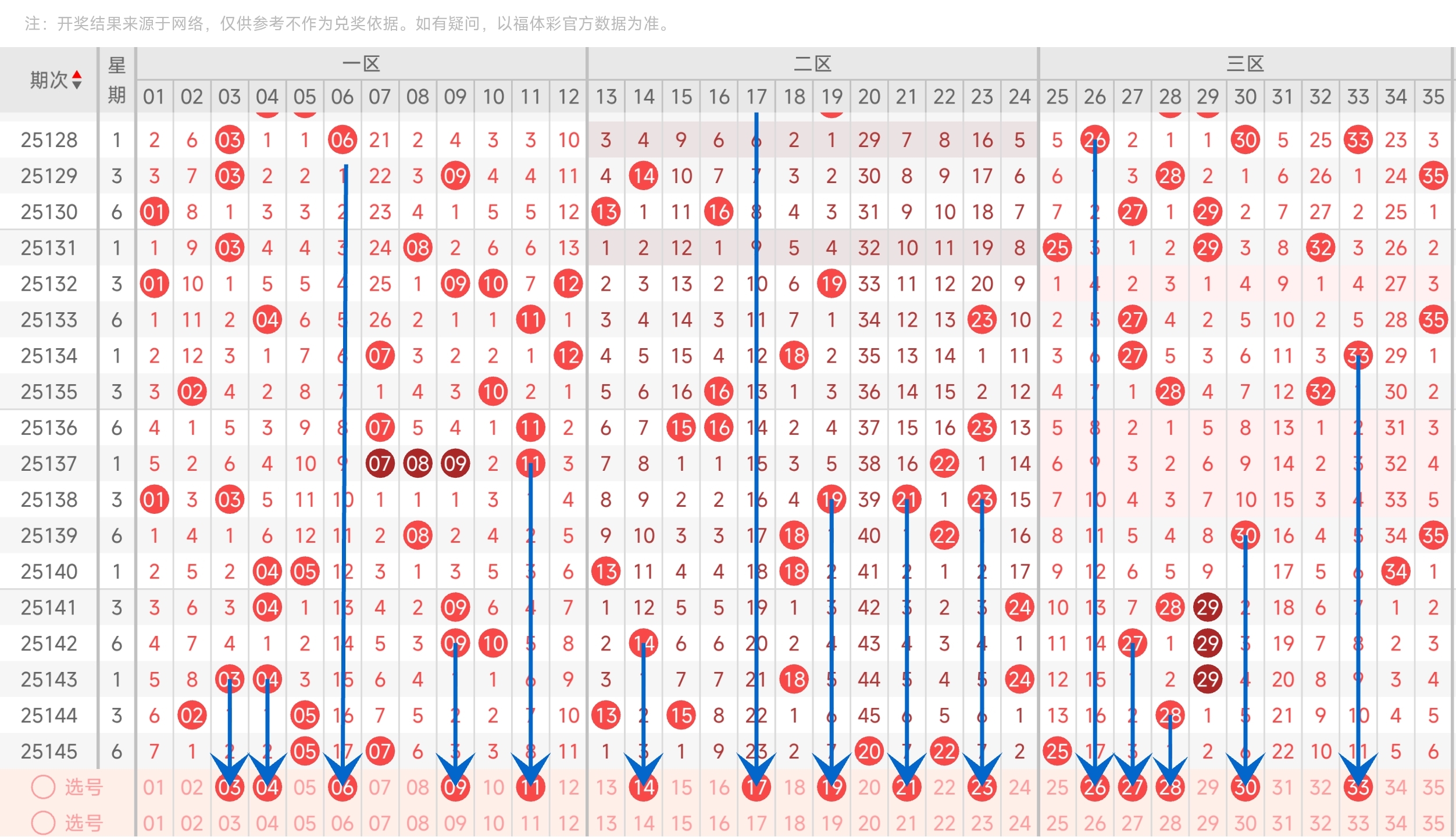 上期开出了25号球,往前一期开出了28号球。通过分析走势图,最近凤尾基本在左边或者中间开出,所以本期我们主要关注左边和中间的号码,防1码回补右边。最后再结合冷热号和遗漏期数,本期我们可以关注26,27,28,30,33等号。综上所述本期三区我们推测可能会开26,27,28,30,33等号码。