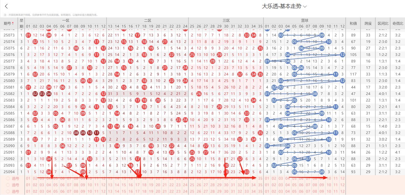 1、前区特征分析:(通过整体走势不难看出每期开奖号都具备以下明显的特征点)