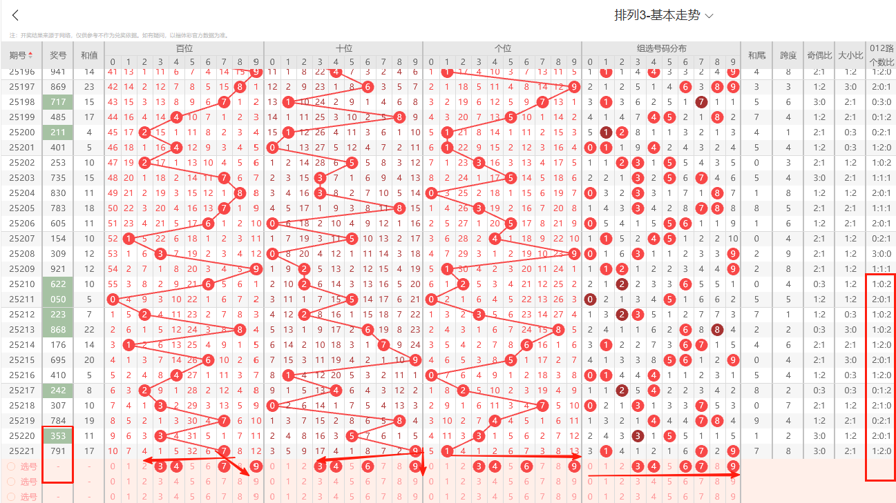 ①百位:上期开出大号奇数7号,在历史开奖记录中显示一般正常的奇偶周期平均在1~3期为普遍现象,奇数连续开出4期上期为1路号码,依据奇偶以及012路周期性规律的转变特征点即本期0路号码有开出的趋势1路号码注意预防。