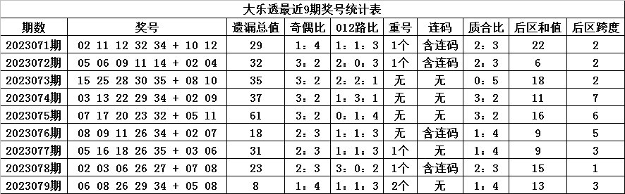 体彩大乐透第2023079期奖号为:06 08 26 29 34 + 05 08,各位号码遗漏期数分别为:0期、2期、0期、4期、2期+3期、0期,前区号码遗漏总期数为8期,012路比为1:1:3,奇偶比为1:4,包含2个重复号码:06、26。后区号码遗漏总期数为3期,和值为13,跨度为3。