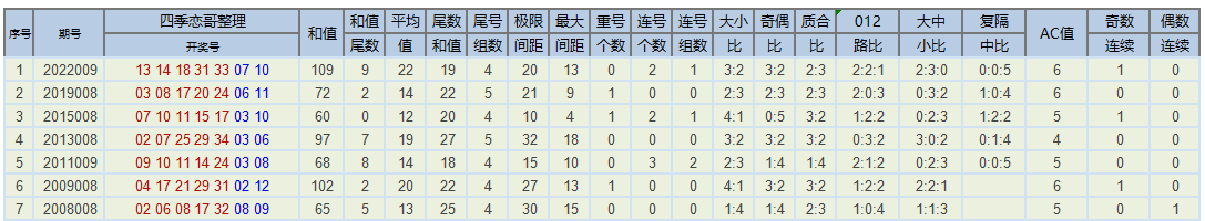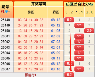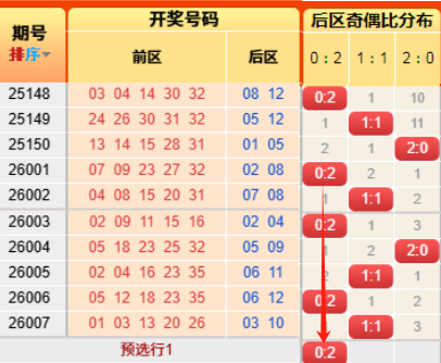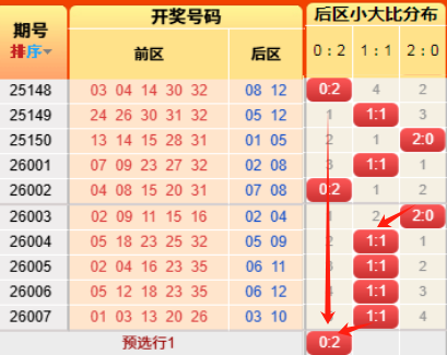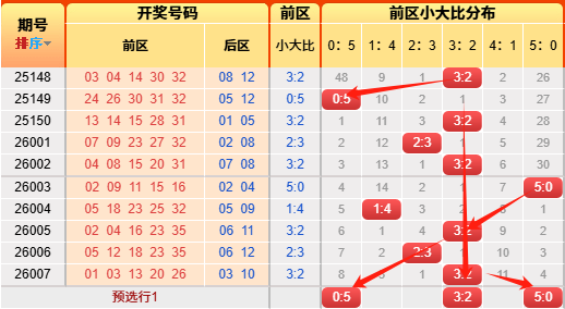 上期前区小大比3:2,新的一年新的总计7期中7期。言归正传我们继续用历史数据说话,前区小大比分成6种0:5、1:4、2:3、3:2、4:1、5:0(如图),我统计了一下历史出现次数,0:5出现107次、1:4出现515次、2:3出现979次、3:2出现815次、4:1出现355次,5:0出现54次,再看近10期小大比出现次数比为1:1:2:5:0:1,通过历史数据对比观察以及根据遗漏对称理论原则,故本期我们选择5:0、3:2、0:5;(具体精准方向请查看小车小大比精选)