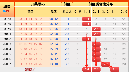 上期质合3:2。来看历史次数统计0:5出现271次、1:4出现911次、2:3出现1020次、3:2出现515次、4:1出现101次、5:0出现7次,再看近十期质合比出现的次数比0:3:6:1:0:0,冷值5:0暂时放弃,再结合图形来看,本期趋势看顺路,初步选择为2:3、1:4、4:1。(具体请点击本条上车查看精选质合比 )