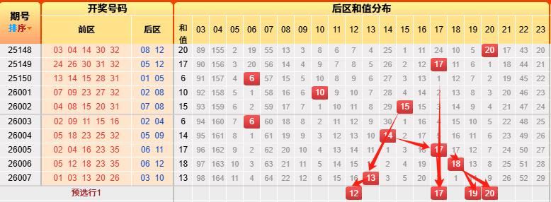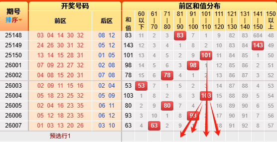 接下来我们来看前区小大、奇偶、质合、和值分布图: