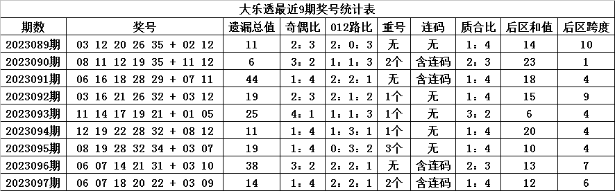 后区跨度:后区近9期跨度分别开出10-1-4-9-4-4-4-7-6,跨度奇偶比为3:6,上期跨度下降1个点位,本期防跨度再次下降,看好开出偶数跨度,参考跨度4。