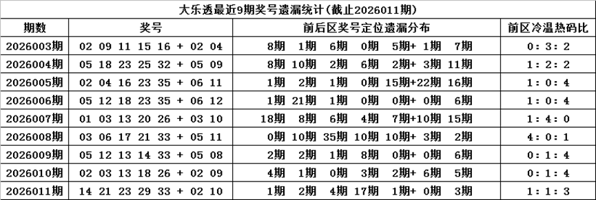 体彩大乐透第2026011期奖号为:14 21 23 29 33 + 02 10,各位号码遗漏期数分别为:1期、2期、4期、17期、1期+0期、3期,前区号码遗漏总期数为25期,012路比为2:0:3,奇偶比为4:1,没有开出重复号码。后区号码遗漏总期数为3期,和值为12,跨度为8。