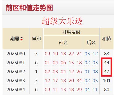 近五期大乐透开奖号码前区和值依次为83→44→47→101→80。前区和值均值为71。前区和值振幅为57,前区和值修正振幅为46。基于动态平衡干预以及波动趋势衡量,本期前区和值推测区间为25-117。基于风险对冲策略,本期前区和值区间缩水为31-107。基于前区和值分析,本期前区质数数量倾向于1-3枚。