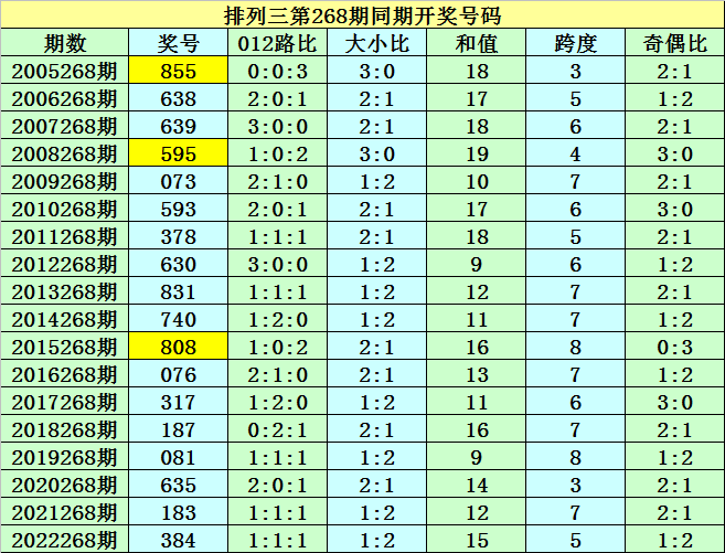 本期为排列三第2023268期开奖,开奖日期为:2023年10月9日,历史上排列三第268期已开出了18次奖号,历年同期开出号码分别为:855-638-639-595-073-593-378-630-831-740-808-076-317-187-081-635-183-384。