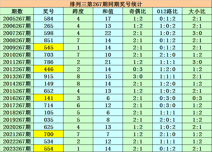 排列三第2023267期奖号为554,组选类型为组三,奖号大小比为2:1,012路比为0:1:2,奇偶比为2:1。